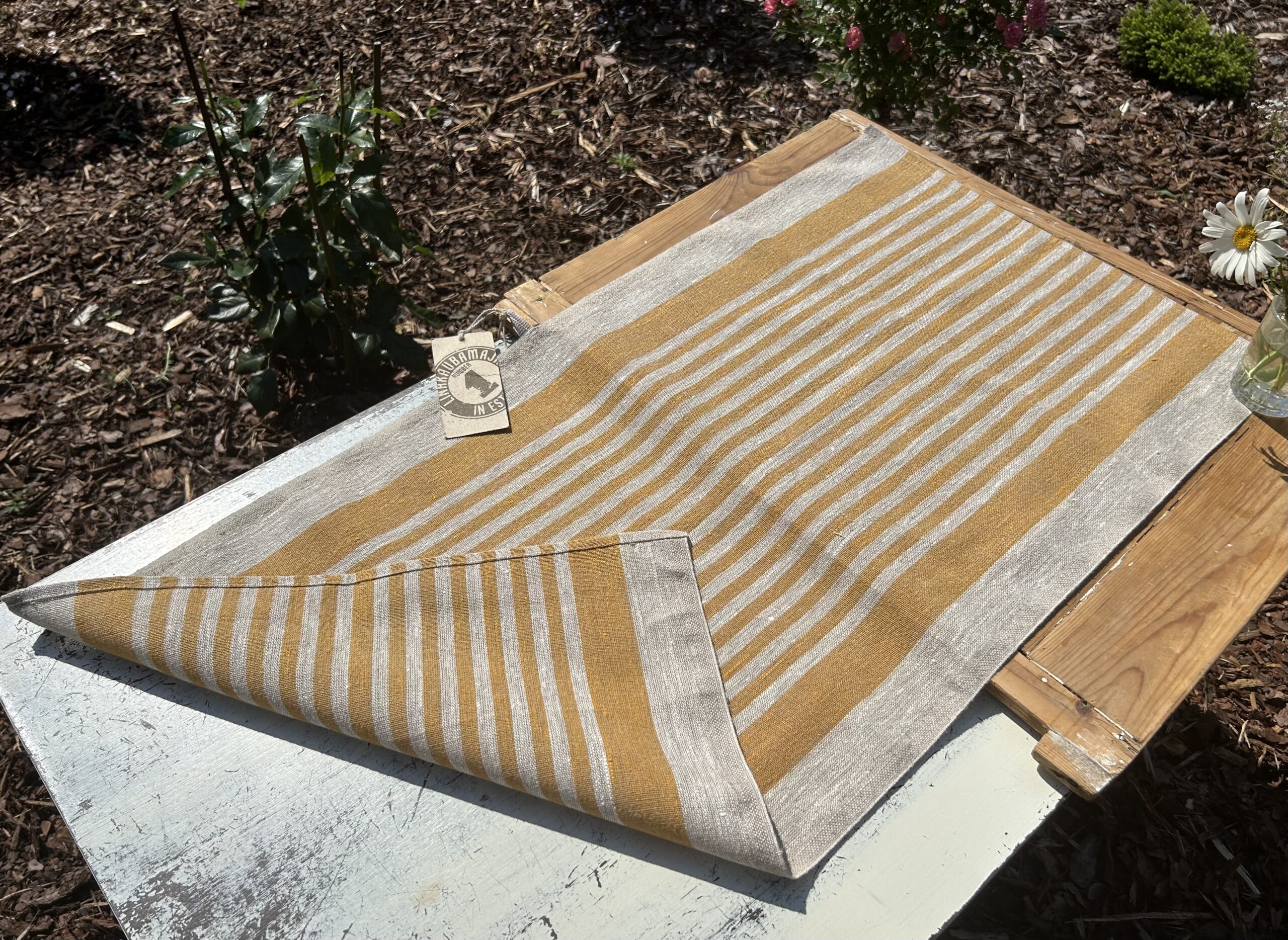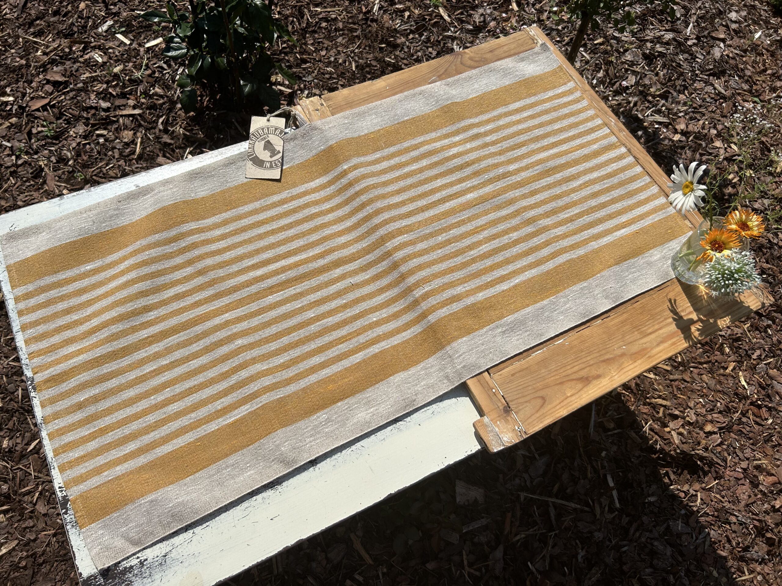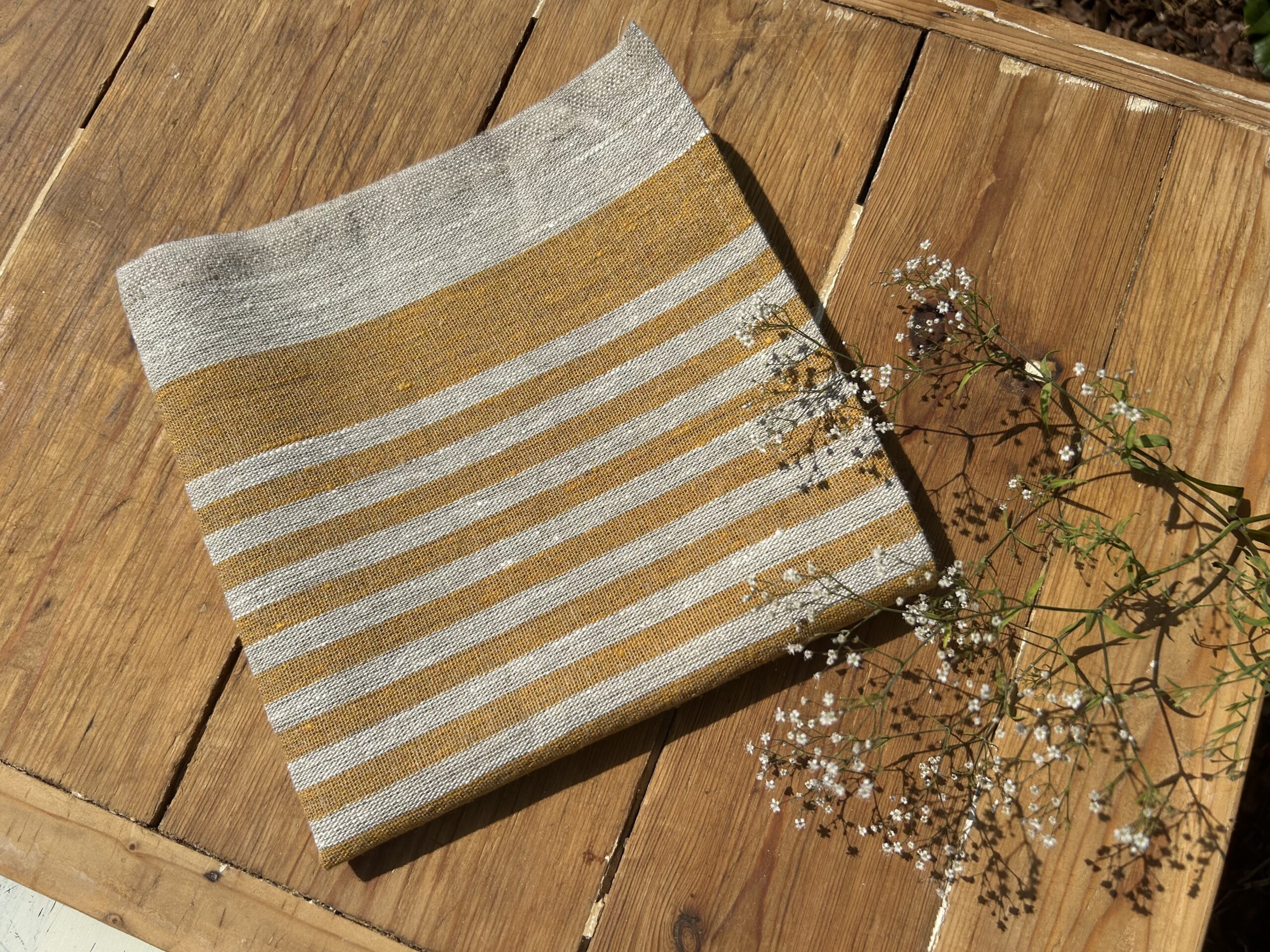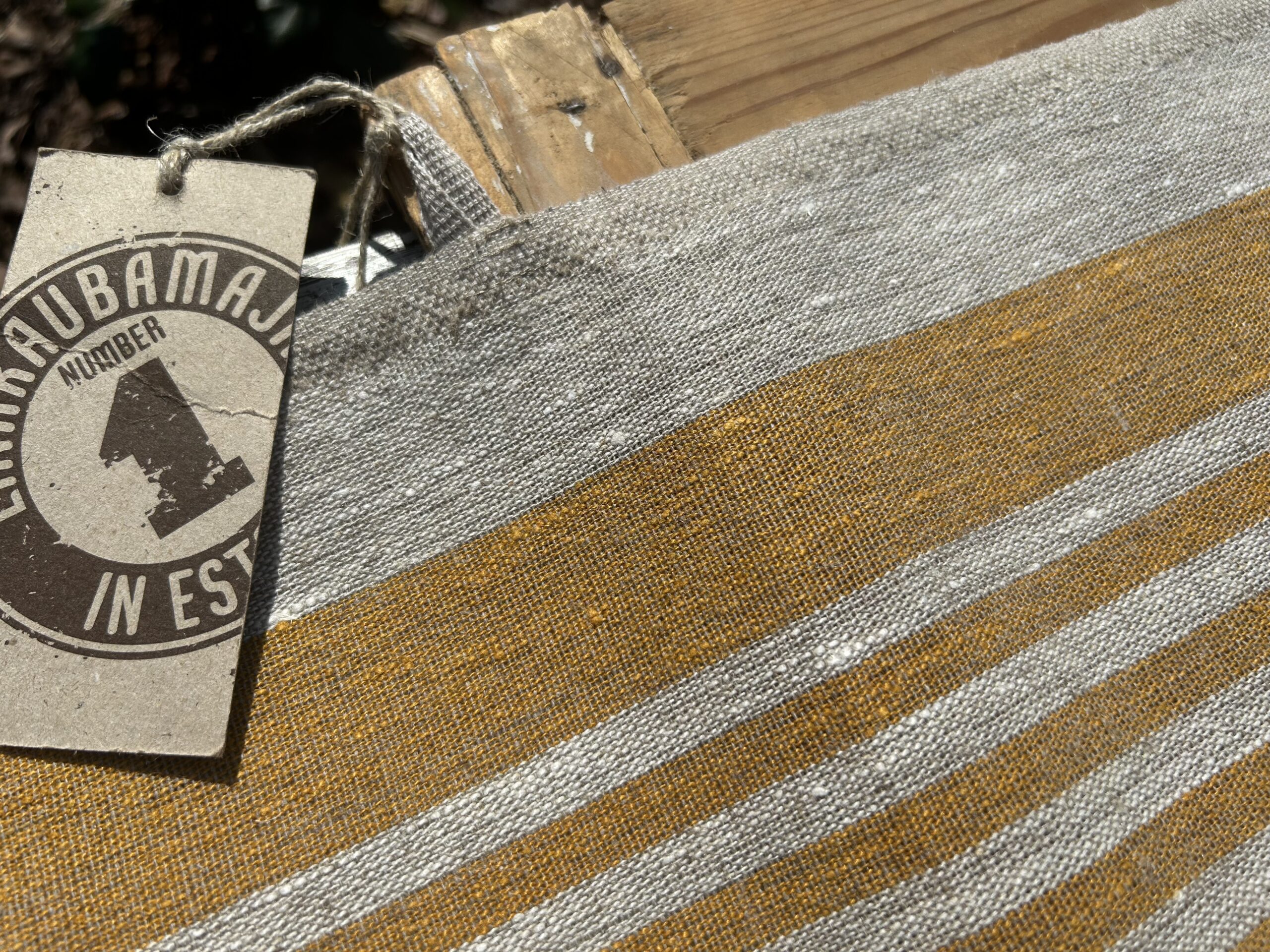 Mitmekülgne linane rätik, mida saab kasutada nii rätina kui ka saunas istumisalusena. Kangas on tihedalt kootud ja tugev, samas hästi vett imav. Linahalli põhitooni elavdavad sinepikollased triibud.