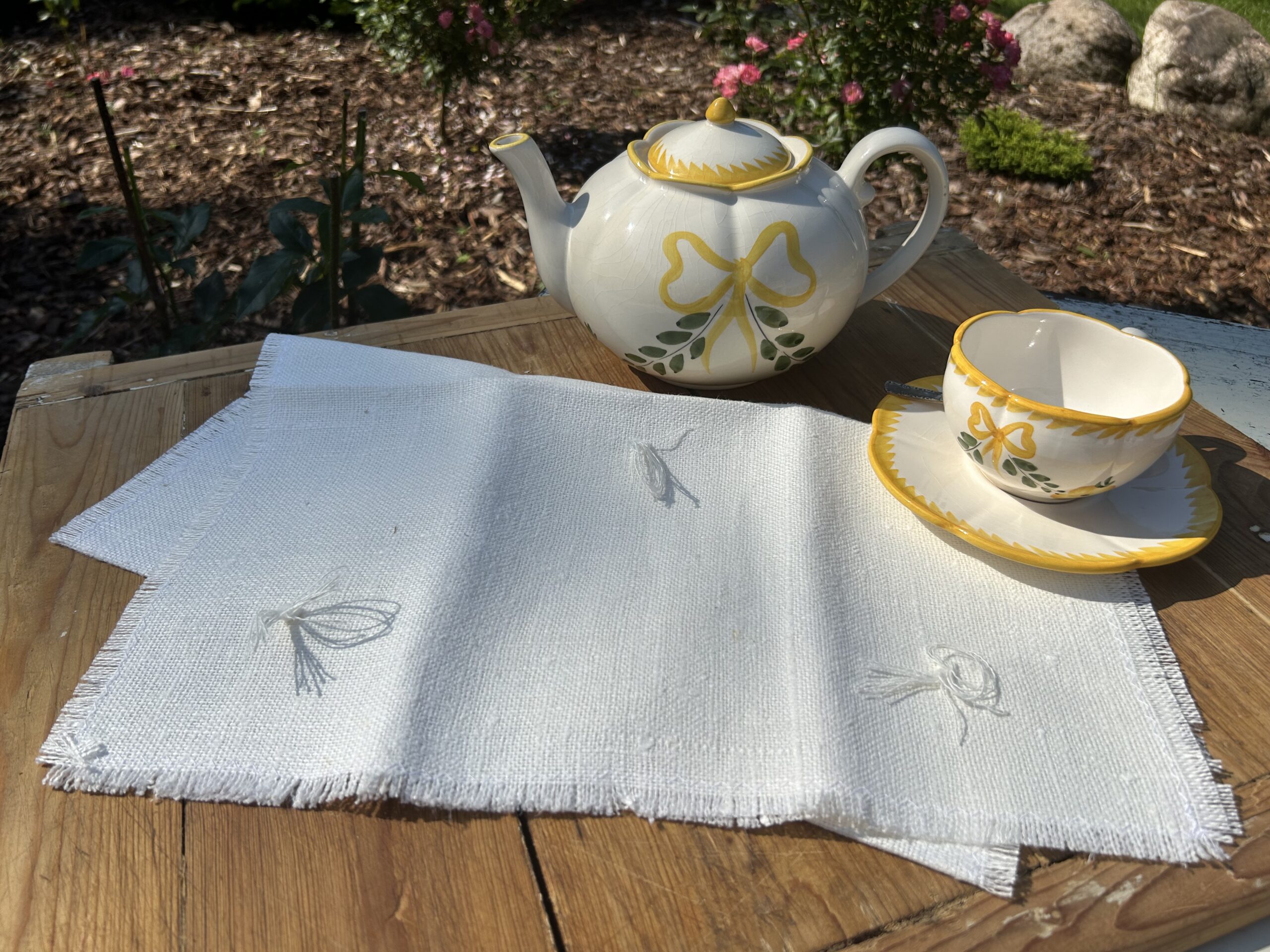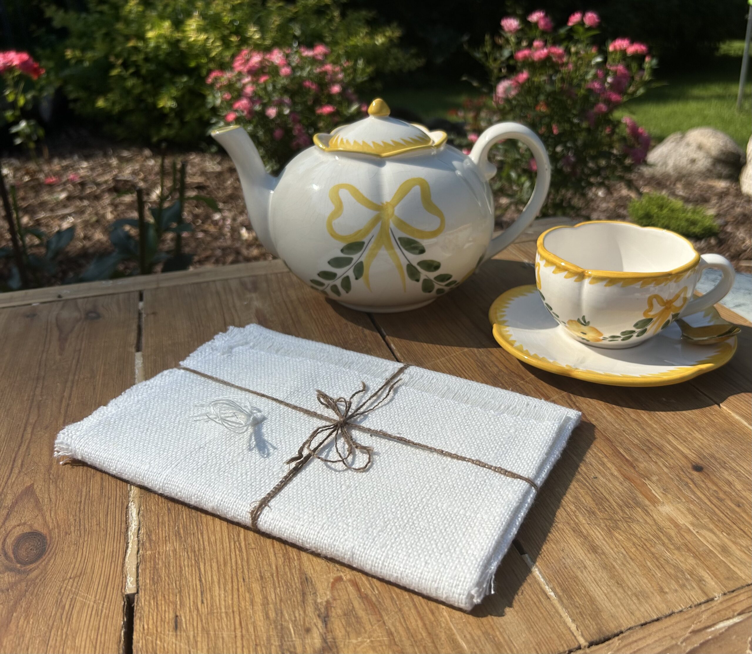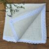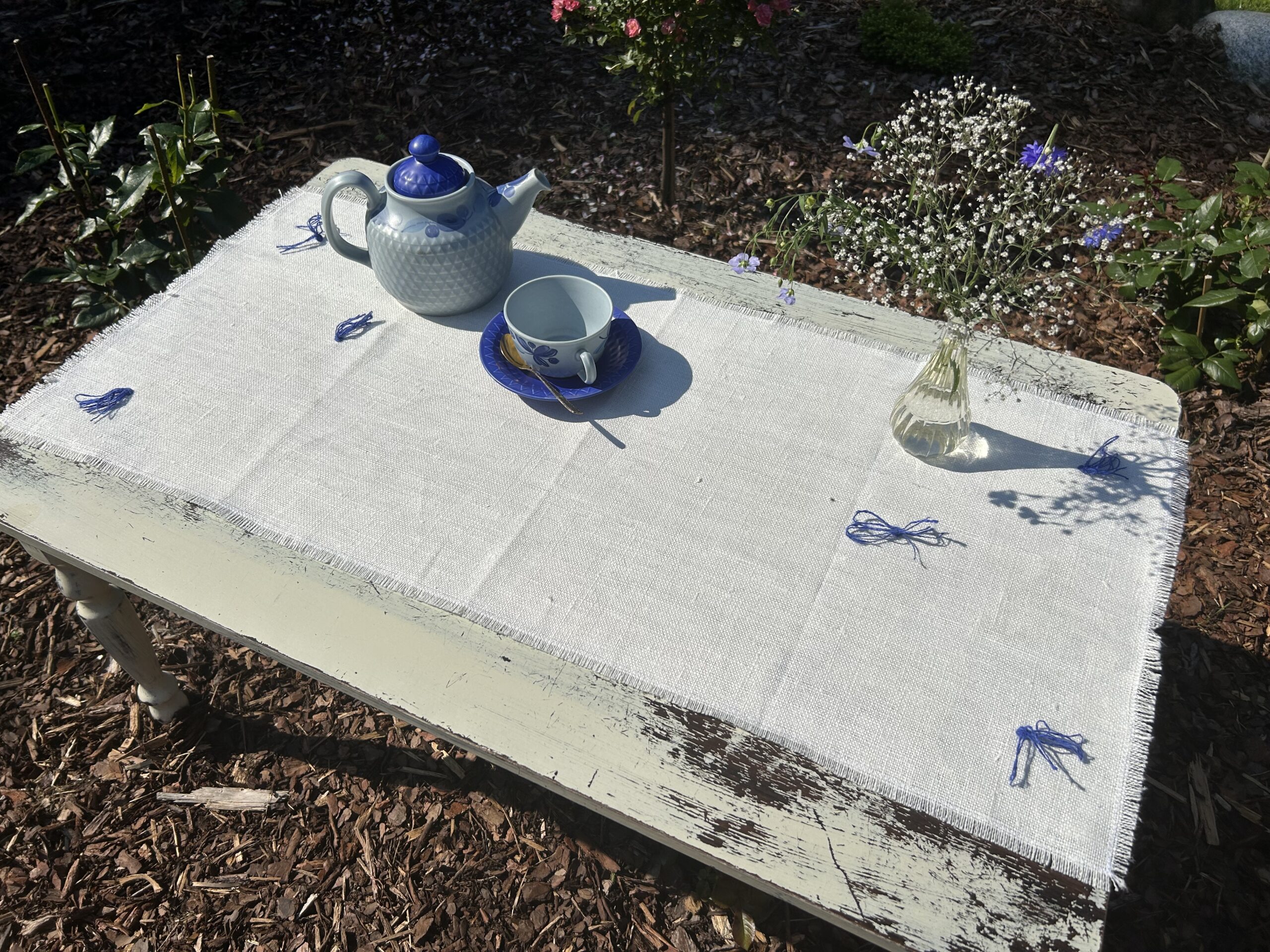 Valgeks töödeldud kotiriidest linik, mille serva kaunistavad käsitsi seotud linased tutid – valge, rukilillesinine või punane. See lihtne ja looduslik detail lisab lauale pidulikkust ning loob hubase meeleolu.